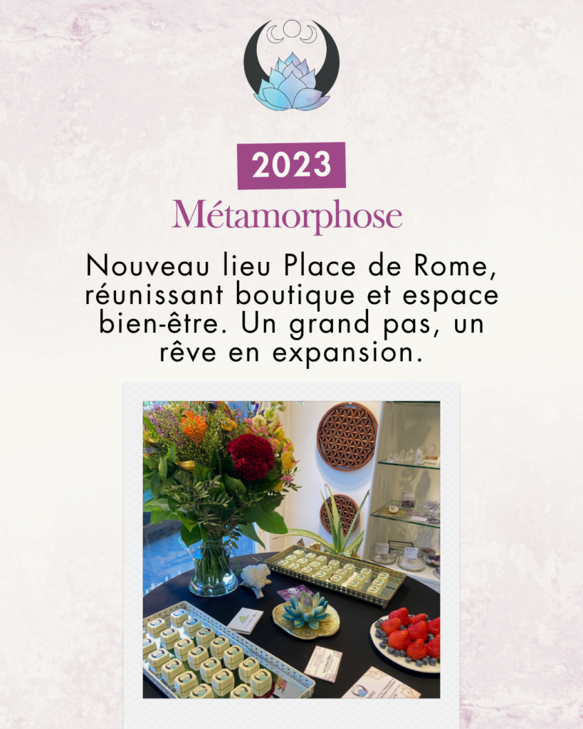 De notre toute première boutique en 2019 à la naissance de notre espace bien-être, de l’arrivée de nouvelles approches thérapeutiques à notre nouveau lieu Place de Rome, de l’expansion de nos soins au lancement de notre boutique en ligne… chaque année a été une étape, une transformation, un souffle d’inspiration.