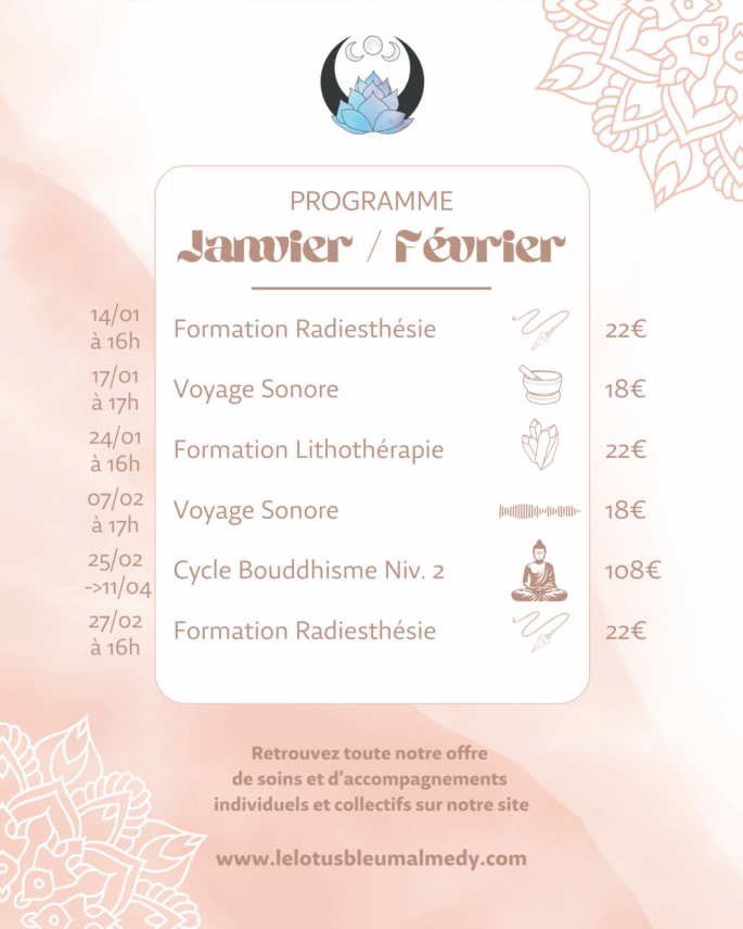 Entre formations, voyages sonores, découvertes énergétiques et cycle dédié au bouddhisme, ces deux mois seront l’occasion de nourrir ton esprit, ton corps et ton chemin intérieur.