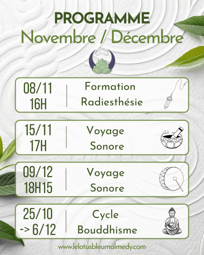 - Sessions de méditation guidée : Deux rendez-vous pour vous reconnecter à vous-même et apaiser votre esprit.