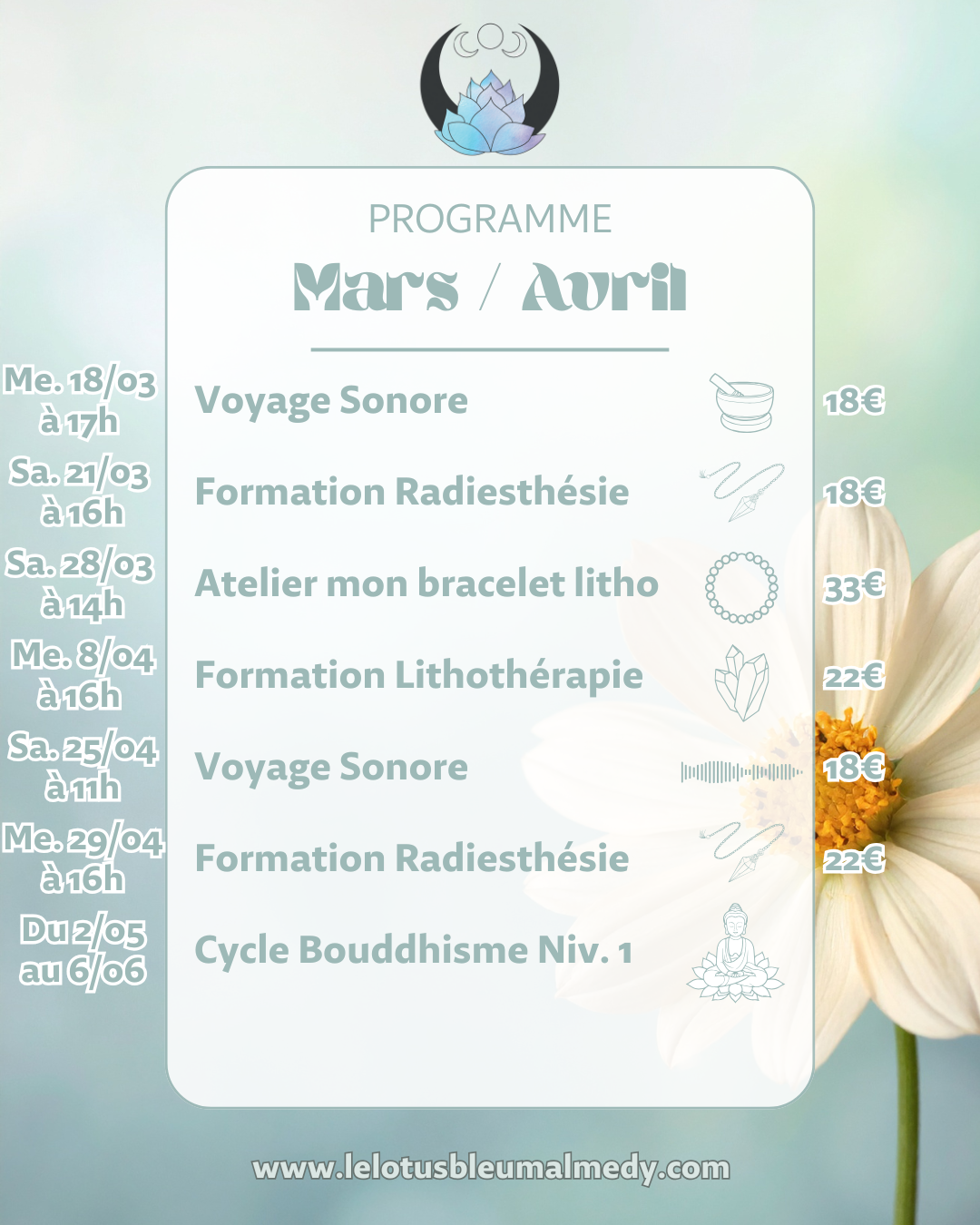 Le Lotus Bleu vous propose un programme riche et varié, mêlant pratiques vibratoires, transmissions et ateliers expérientiels.